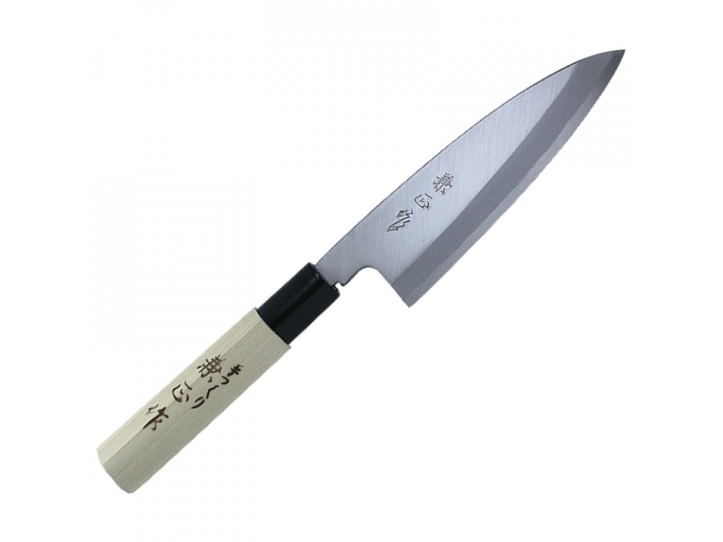Vysoce kvalitní kuchyňský nůž v japonském stylu značky Kanetsune pro profesionální použití. Jádro ostří je vyrobeno z oceli Hitachi White Steel 3, svařeného měkkou žehličkou pro vysoký řezný výkon. Tradiční dřevěná rukojeť magnólie s plastovou podložkou.