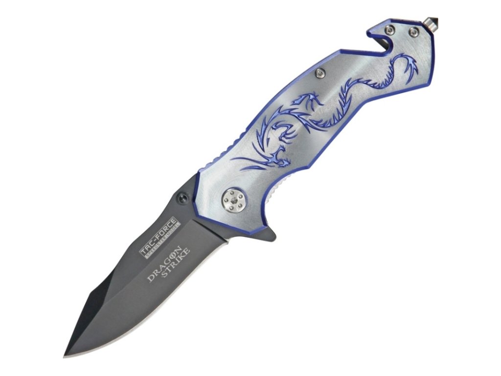 Rescue nůž Dragon se vzorem draka na rukojeti. Čepel v černé barvě, kolík pro jednoruční ovládání, klip na opasek, řezač pásů a hrot pro rozbíjní skla v zadní části nože. Délka v zavřeném stavu: 12 cm Délka čepele: 7,6 cm Ocel: nerez Pojistka čepele: linerlock Rukojeť: hliník Klip na opasek Hrot k rozbíjení skla Řezač pásůDoplňkové parametry