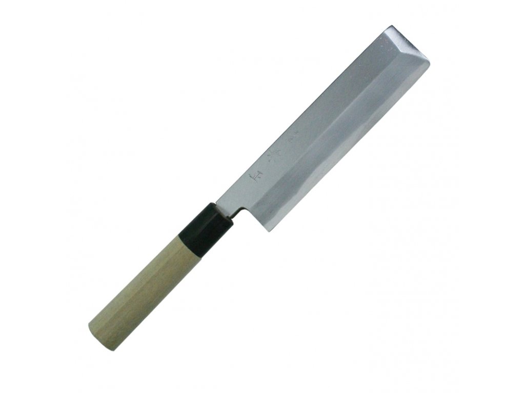 Vysoce kvalitní kuchyňský nůž v japonském stylu pro profesionální použití. Jádro ostří je vyrobeno z Hitachi White Steel 2 svařeného měkkou žehličkou pro vysoký řezný výkon. Nůž Usuba (Single Bevel Grind) doplňuje tradiční dřevěná rukojeť Magnolia ve tvaru D.