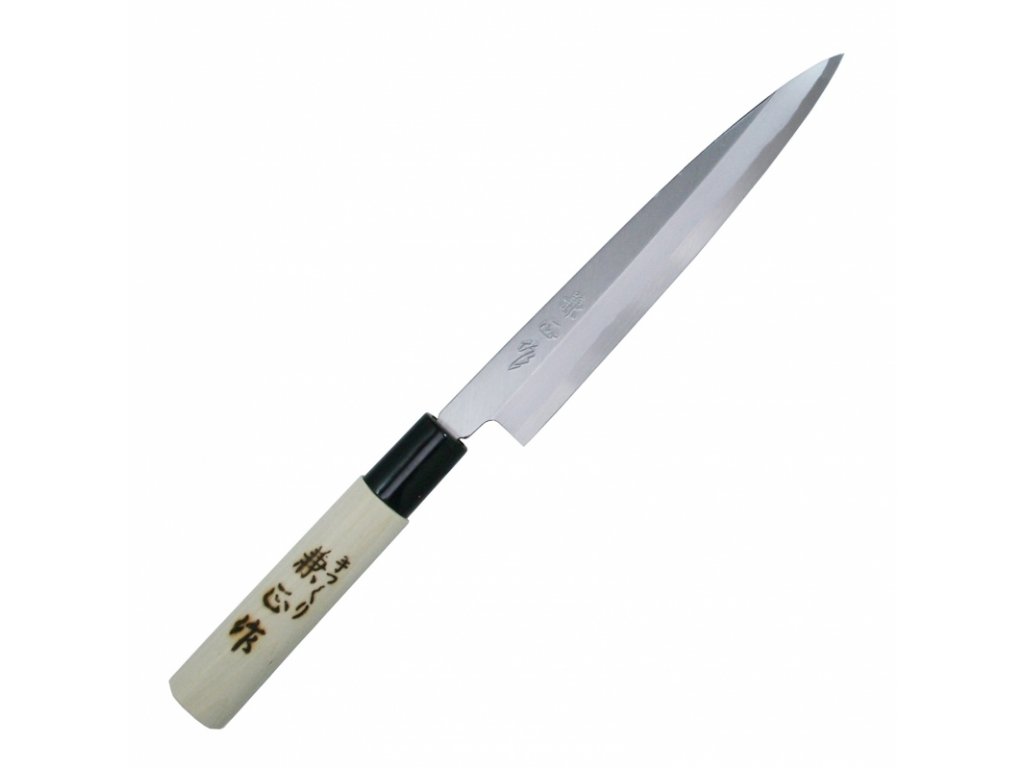 Hledáte originální dárek pro kuchaře či milovníka vaření. Japonský nůž Yanagiba (Single Bevel Grind) značky Kanetsune určitě nezklame. Jádro ostří je vyrobeno z Hitachi White Steel 3 svařeného měkkou žehličkou pro vysoký řezný výkon. Tradiční dřevěná rukojeť je vyrobena z dřeva Magnolia.